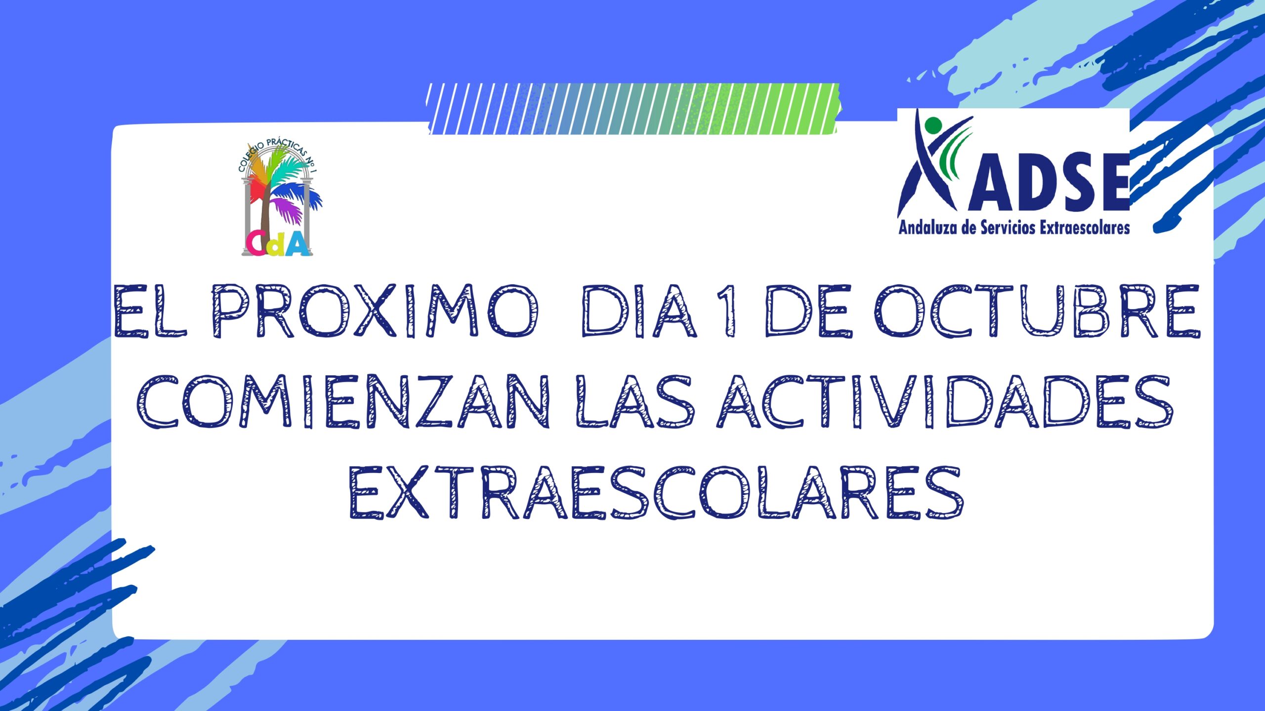 Noticias27 septiembre 202427 septiembre 2024Inicio Actividades Extraescolaresby Ceip Practicas Nº 10 0 El próximo martes 1 de Octubre comienzan las Actividades Extraescolares en horario de 16 a 17 horas.