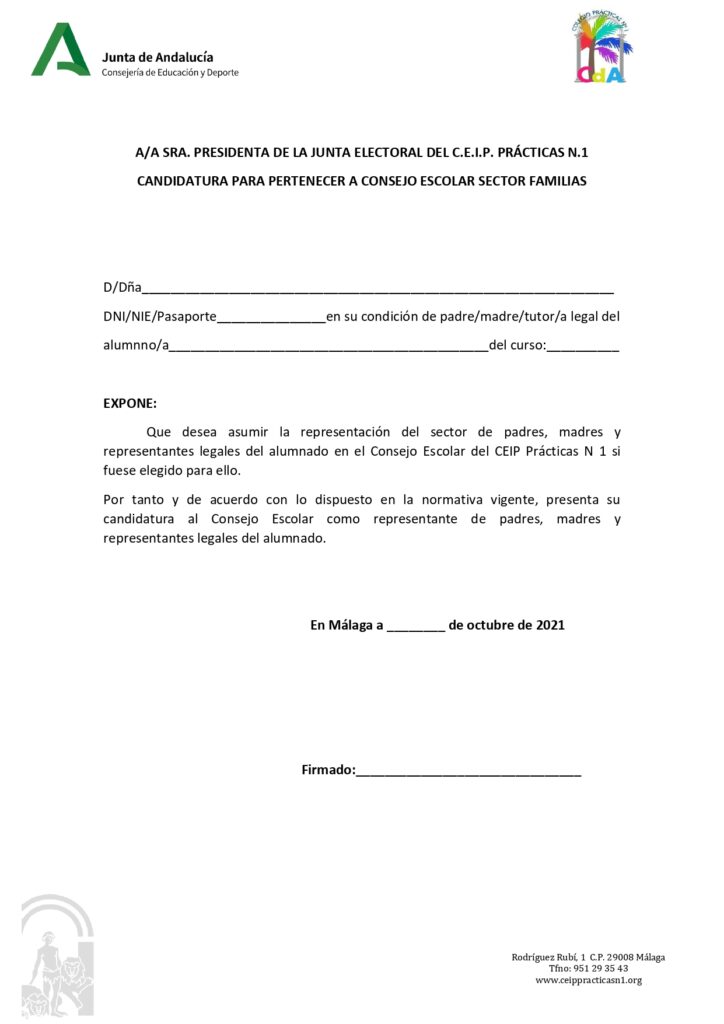 Noticias19 octubre 202119 octubre 2021Presentación de Candidaturas de Padres/Madres al Consejo Escolarby Ceip Practicas Nº 10 0 Por si alguien quiere visualizarla mejor o descargársela: Pulsar para ver CANDIDATURA-FAMILIAS-CE-21Descarga Se pueden presentar candidaturas hasta el 28 de octubre.